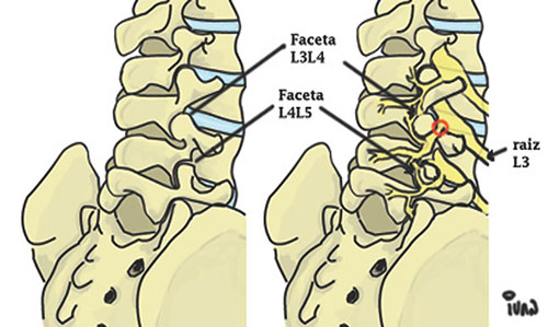 As patologias facetárias além da dor lombar podem gerar dor irradiada para membros inferiores por compressão da raiz nervosa no foramem pela própria hipertrofia facetaria ou pela formação de cistos sinoviais.