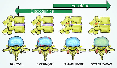 Kirkaldy-Willis descreveu com clareza este processo de envelhecimento em três fases a seguir: inflamatória, instabilidade e estabilização. Em geral os processos degenerativos relacionados as facetas estão mais associados as fases de instabilidade e estabilização (Figura 2). Além do processo degenerativo normal outras condições podem gerar dor facetaria como por exemplo: artrite reumatóide, espondilite anquilosante, artrite reativa, menisco sinovial encarcerado, condromalácia facetaria, pseudogota, infecção aguda ou crônica além de eventos traumáticos.