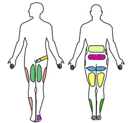 Figura 3 – Lombar Baixa: L5–S1, L4–L5, L3–L4 Nádegas: L5–S1, L4–L5, L3–L4 Coxa Lateral: L5–S1, L4–L5, L3–L4, L2–L3 Coxa Posterior: L5–S1, L4–L5, L3–L4 Grande Trocanter: L5–S1, L4–L5, L3–L4, L2–L3 Virilha: L5–S1, L4–L5, L3–L4, L2–L3, L1–L2 Coxa Anterior: L5–S1, L4–L5, L3–L4 Lateral da perna: L5–S1, L4–L5, L3–L4 Lombar superior: L3–L4, L2–L3, L1–L2 Flanco: L1–L2, L2–L3 Pé: L5–S1, L4–L5.