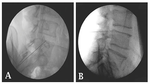 Tanto o bloqueio quanto a injeção intraarticular facetária podem ser realizadas através do uso da radioscopia (figura 4 e figura 5) ou do ultra-som.