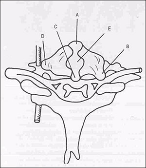 Fig. 1. Representação esquemática dos locais possíveis para as hérnias cervicais: A – anterior, B – póstero-lateral, C – póstero-medial. D – Lateral, E – central
