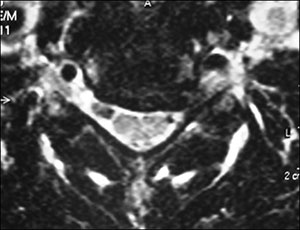 Fig. 2. Imagem axial em T2 de RNM de doente com hérnia cervical comprimindo a raíz de C6.