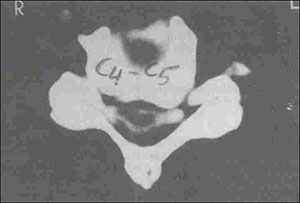 Fig. 3. Mielotomografia demonstrando alterações degenerativas e estenose do canal cervical