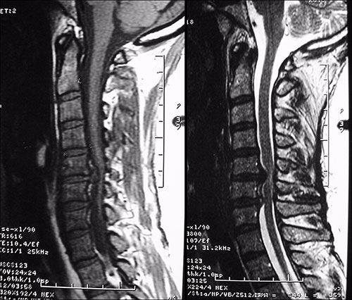 Fig. 5. Hérnias de disco C5-C6 e C6-C7 vistas na RM, exame ponderado em T1 a esquerda e T2 a direita.