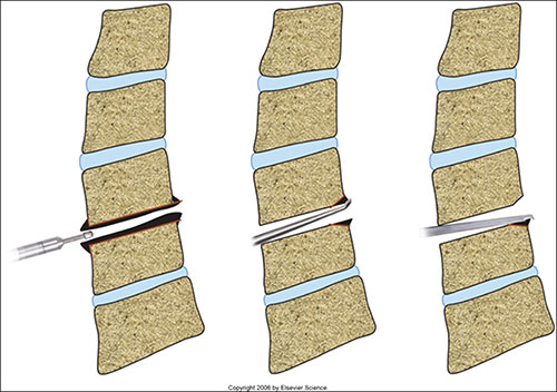 As cirurgias pela via anterior são mais fáceis de serem executadas (Fig.6). A forma mais comum do tratamento pela via anterior envolve a discectomia associada à artrodese (pode-se empregar enxertos estruturados autólogos, cages, placas e parafusos). Além da discectomia, esta via permite a ressecção dos osteófitos, mas não é possível visualizar a raiz de forma adequada.