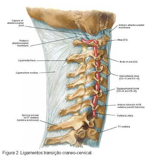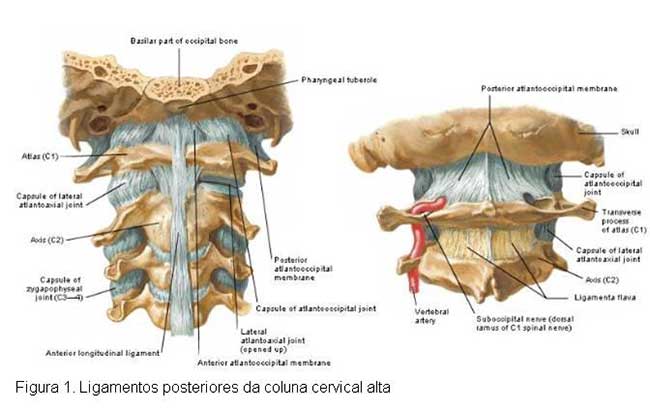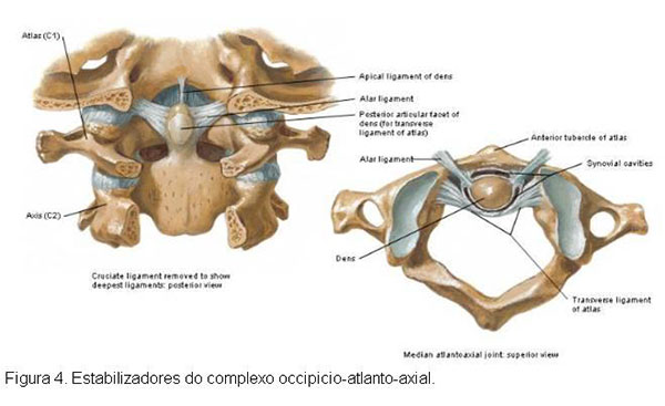 Os movimentos possíveis no segmento occipipto-atlantoaxial são estabilizados por um conjunto de ligamentos e pela membrana tectorial. A membrana tectorial, o ligamento nucal, o ligamento longitudinal posterior e o ligamento cruciforme conferem estabilidade regional ao movimento de flexão da porção superior da coluna cervical. A estabilidade aos movimentos de rotação e inclinação lateral é conferida pelos ligamentos alares. A rotação da cabeça para a direita é limitada pelo ligamento alar esquerdo e vice-versa, conforme esclarecem Dvorak e Panjabi, e, durante a inclinação da cabeça para um lado, a porção occipital do ligamento alar do mesmo lado está relaxada e a porção mais próxima ao atlas está estirada. O atlas move-se na mesma direção da inclinação, porém não se observa sua rotação. O movimento de extensão de parte superior da coluna cervical é limitado principalmente pela porção transversa dos ligamentos alares. Quando se adiciona ao movimento de rotação da cabeça o movimento de flexão, há estiramento máximo dos ligamentos alares, com maior vulnerabilidade de lesão.(figuras 1,2,3,4).