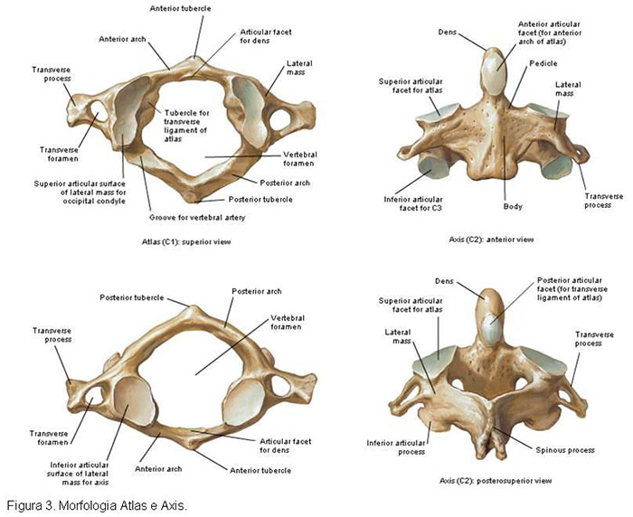 Articulando-se com os côndilos occipitais está a primeira vértebra cervical, o atlas, que não apresenta corpo vertebral, possui dois arcos um anterior e outro posterior, não há processo espinhoso desenvolvido na união das hemilâminas posteriores, mas um pequeno tubérculo dorsal. Nas massas laterais existem as superfícies articulares superiores em articulação com o osso occipital e as inferiores para com o áxis.Na face medial de cada massa lateral se insere o ligamento transverso que divide o forame delimitado pelos arcos e massas laterais em dois segmentos: o anterior, no qual se localiza o dente do áxis, e o posterior, no qual passa a medula. Articula-se com o áxis a Segunda vértebra cervical, através de sua faceta articular inferior.