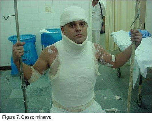 O tratamento conservador das fraturas do côndilo occipital evolui com bons resultados, ficando o paciente livre de dor cervical, mantendo o arco total de movimento do segmento envolvido, em média após três meses de tratamento. Preconiza-se o uso do colar tipo Philadelphia para os casos classificados como tipo I ou II de Anderson e Montesano e uma imobilização mais rígida, como halogesso ou gesso tipo Minerva para as fraturas classificadas como tipo III (figura 7).