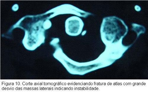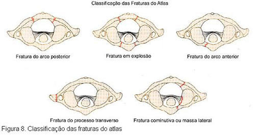 A pressão exercida sobre o atlas pode não só determinar a fratura dos arcos como também a ruptura do ligamento transverso, que é a principal estrutura a assegurar a estabilidade anterior dessa vértebra, impedindo o seu escorregamento sobre o áxis (figura 8).