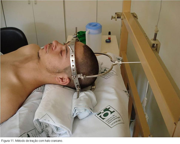 Após instalado o halo, inicia-se a tração, em posição de repouso. O peso inicial deverá ser de 4 a 8 Kg, dependendo do peso do paciente, devendo a cama ser colocada em proclive, funcionando como contração.