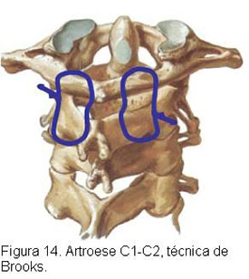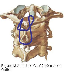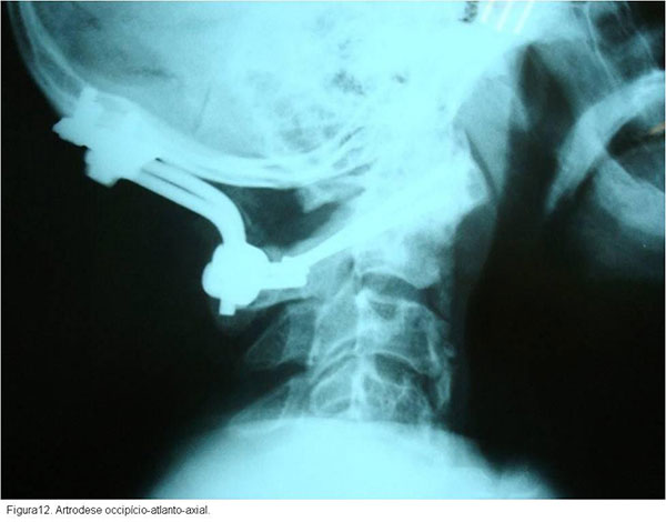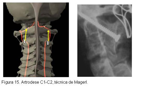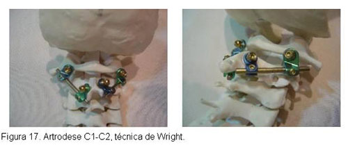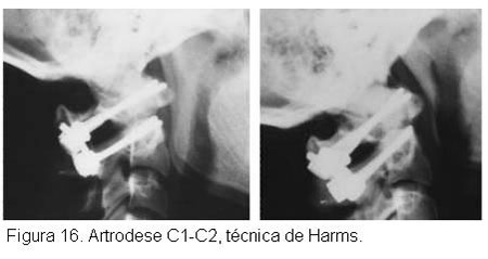 Se não houver consolidação óssea ou união fibrosa estável, está indicada a artrodese C1 – C2, a despeito do alto custo funcional que o paciente enfrentará com a perda significativa da rotação cervical. Vale salientar que as fraturas da coluna cervical, freqüentemente, coexistem com traumatismos cranianos com perda da consciência, sendo indispensável o seu exame radiológico na vigência desses últimos traumatismos. Também nos traumatismos graves da face, devido à sua magnitude, não é raro que passem despercebidas lesões de C1 – C2 que, como foi referido, por vezes determinam sintomatologia pobre. Nesses casos, também, a coluna cervical sempre deve ser radiografada. Lesões associadas podem determinar técnicas diferentes para artrodese C1-C2, por exemplo a fratura do arco posterior de C1 impossibilita técnicas de amarrilho posterior.As possibilidades de artrodese C1-C2 são: amarrilhos como Gallie e Brooks propuseram, o parafuso transarticular segundo estudo de Magerl, parafuso massa lateral de C1 e pedicular em C2 em conformidade com Harms, ou ainda, parafuso em massa lateral de C1 e intralaminar em C2 de acordo com técnica de Wright (figuras 13,14,15,16 e 17).