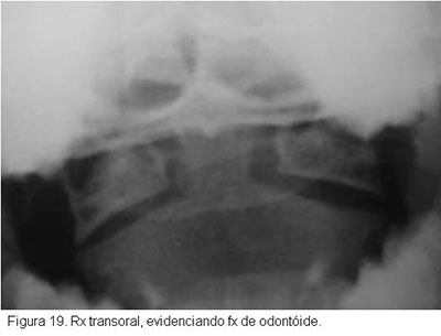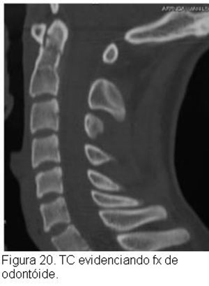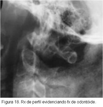 Ainda quanto ao diagnóstico radiológico das fraturas sem desvio deve-se acrescentar que carece haver cuidado especial com as crianças, quando ainda não ocorreu ossificação completa da vértebra.Radiologicamente, na criança, o dente e o corpo do áxis estão separados por uma faixa de tecido transparente ao raio X, que progressivamente vai estreitando, até desaparecer aos 10-11 anos, quando o dente e o corpo do áxis se fundem, o que raramente não se completa em idades maiores. A não fusão do dente do áxis pode simular uma fratura sem desvio. Os pacientes com fratura do dente do áxis freqüentemente têm queixas pobres, apenas de cervicalgia pouco intensa e certa dificuldade para a movimentação do pescoço, não raramente procurando tratamento vários dias depois do acidente. Algumas vezes procuram tratamento referindo dor violenta, grande dificuldade à movimentação e suportando a cabeça com as mãos. Sinais neurológicos só aparecem numa pequena minoria (Figuras 18,19 e 20).