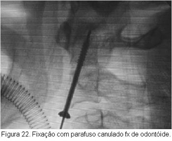 As fraturas tipo II devem ser avaliadas quanto à possibilidade de pseudoartrose e comorbidades do uso prolongado de gesso minerva, sendo indicado em casos selecionados o tratamento com redução incruenta com halo-tração, associado à fixação interna com parafuso canulado entre o corpo e o dente de C2 por via cervical anterior, técnica de Nakanishi, difundida por Bohler evitando-se dessa forma a artrodese C1-C2 e permitindo a manutenção da rotação de C1-C2 (figura 22).
