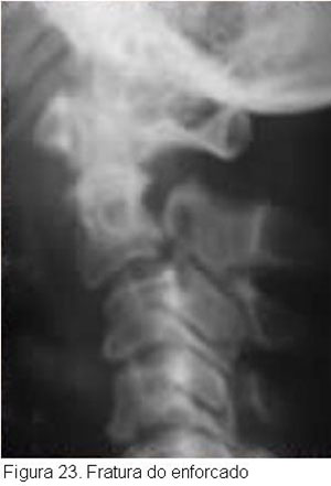 Essa fratura, apesar do grande escorregamento de C2 sobre C3 que freqüentemente aparece, muito raramente condiciona lesão medular, porque ela, ao contrário de produzir um estreitamento do canal espinhal, leva a um alargamento do mesmo. (Figura 23).