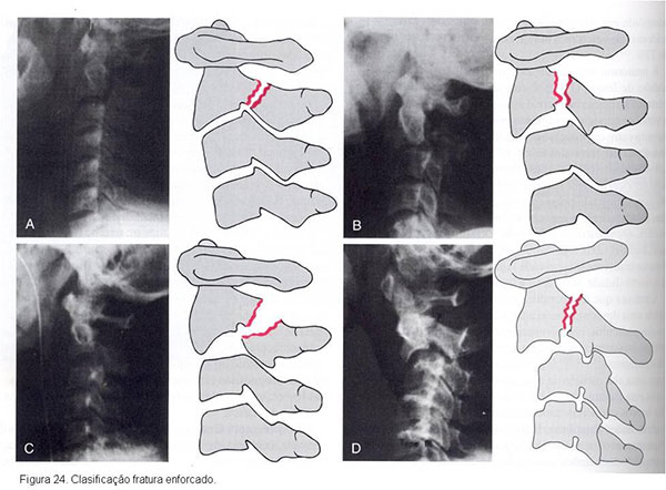 A classificação mais utilizada é a de Levine e Edwards, que avalia a fratura quanto ao escorregamento de C2 sobre C3 e sua angulação, sugerindo mecanismos de trauma e gravidade da fratura, apontando desta forma propostas terapêuticas (figura 24).