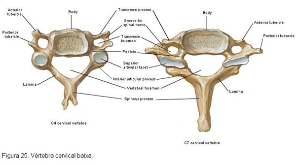 As vértebras cervicais subaxiais caracterizam-se por seu corpo pequeno, canal medular triangular, processos transversos com forames por onde passa a artéria vertebral, pedículos lateralizados e processos espinhosos bífidos. A orientação facetaria se dá no plano axial, como as telhas no telhado, montadas uma sobre as outras, permitindo os movimentos de rotação e inclinação lateral da cabeça.(figura 25)