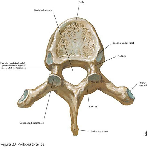 As vértebras torácicas iniciam com corpos pequenos e triangulares e vão aumentando de tamanho na medida em se aproximam da coluna lombar, apresentam articulações costocondrais para receber as costelas. A orientação facetaria se dá no plano coronal, permitindo facilmente os movimentos de rotação e inclinação lateral. (figura 26)