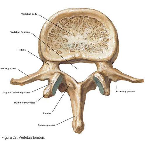 As vértebras lombares apresentam corpos vertebrais grandes, processos espinhosos curtos. A orientação facetaria se dá no plano sagital facilitando os movimentos de flexão e extensão do tronco. (figura 27)