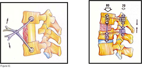 Se houver uma lesão maior que compromete a resistência do corpo, ou se a parte posterior da coluna estiver envolvida (lesão anterior e posterior), há necessidade de estabilização cirúrgica, restabelecendo a curvatura normal e altura do corpo, através de uso de estruturas de sustentação, que podem ser do próprio paciente, como enxerto cortical do osso ilíaco, ou associação com hastes, placas ou gaiolas metálicas.(figura 32)