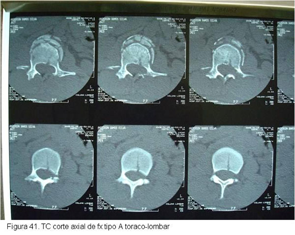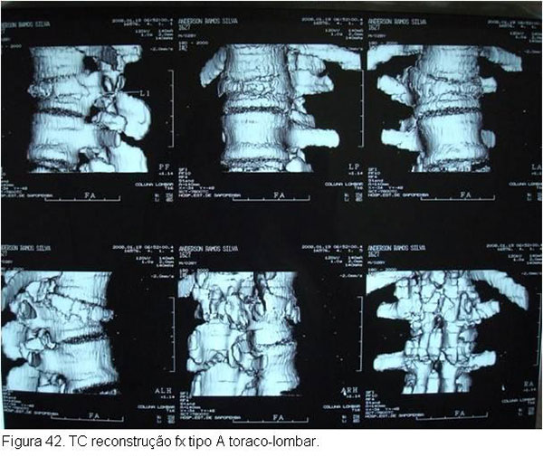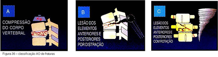 As fraturas cervicais sub-axiais, torácicas e lombares são classificadas de forma semelhante. A fratura de coluna recebe o número cinco como identificação desta região anatômica, sendo dividida em três grupos: 1- cervical, 2- torácico e 3- lombar. Cada grupo receberá uma letra conforme o padrão básico de lesão, sendo: A- lesões por compressão do corpo vertebral, B- lesões por distração dos elemento anterior e/ou posteriores, e C- lesões do tipo A ou B associadas a mecanismo de rotação ou fx-luxação complexa. (figura 36)