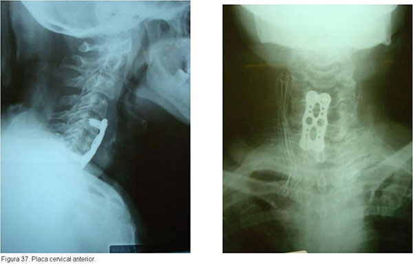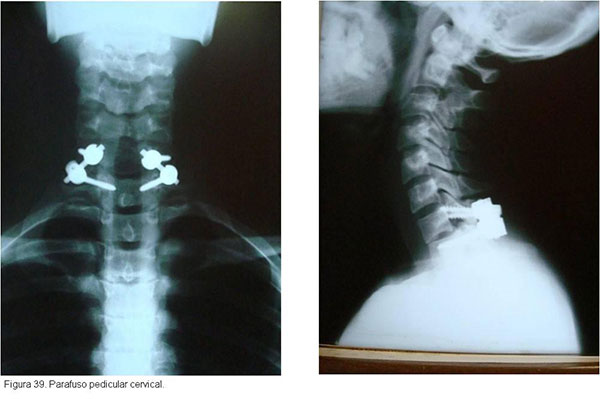 As fraturas cirúgicas da região cervical são estabilizadas com amarrilhos, placas e parafusos, sempre associados à enxertia óssea para facilitar a artrodese. O uso de estabilização anterior e/ou posterior depende do tipo de fratura.(figuras 37, 38, 39)
