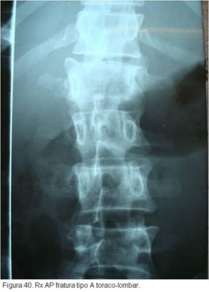 O alargamento do espaço interpedicular no Rx ântero-posterior indica fratura tipo A com encunhamento significativo do corpo. O aumento do espaço entre os procesos espinhosos no Rx em perfil no segmento fraturado indica fratura tipo B, devido à lesão ligamentar presente.