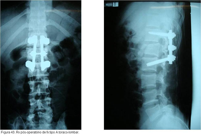 O tratamento seguirá o mesmo raciocínio discutido anteriormente, dependendo de quais estruturas estiverem lesadas. Particularidades da região toraco-lombar e lombar determinarão abordagens especificas caso a caso.(figuras 40, 41, 42 3, 44, 45)