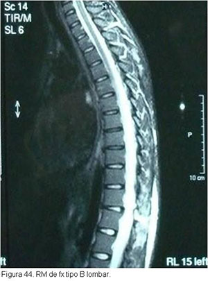 A fratura do tipo B envolve traumas em distração, levando a uma lesão anterior associada a lesões posteriores, sendo cirúrgica na maioria dos casos, necessitando estabilização anterior e posterior. É possível a obtenção de estabilidade anterior através de acesso posterior isolado, ou com dupla via de acesso.