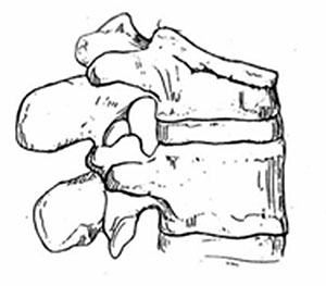 Nesta figura você pode ver uma típica compressão da vértebra. Você pode ver que a altura e o ângulo da vértebra caída (superior) são muito menores que o da vértebra normal vizinha (vértebra inferior).