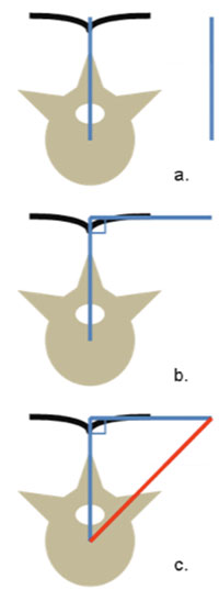 Utilizando a técnica de triangulação deve-se inicialmente realizar uma imagem antero-posterior e marcar os platôs vertebrais e o centro do disco, realiza-se então uma imagem de perfil, e mede-se a distância do centro do disco à pele (Fig. 3a.), realiza-se então uma nova imagem antero-posterior, e utilizando a mesma distância medida na incidência perfil localiza-se o ponto de entrada do fio guia (Fig. 3b), com estas medidas obtem-se o ângulo de penetração do fio guia, que é de 45º, pois com estas medidas é formado um triangulo isósceles retângulo (Fig. 3c).