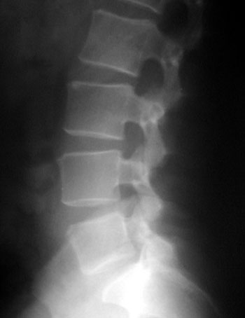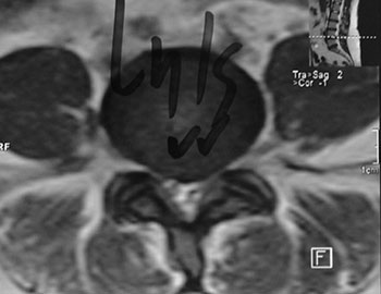 Foram realizadas radiografias onde, não sendo encontradas alterações significativas (Fig. 6); optado então por realizar ressonânca magnético sendo evidenciada uma hernia contida L4-L5 (Fig. 7).