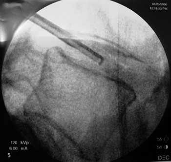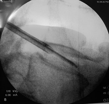 A introdução do fio guia deve ser feita com o auxílio de fluoroscopia, e pode ser feita através de duas técnicas: em uma delas é utilizado o método de triangulação para se obter o ponto de entrada, e na segunda utiliza-se uma incidência oblíqua.