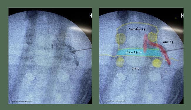 Podemos observar na Figura ao lado um Rx da coluna lombar em que se observa o contraste em preto corando a raiz de L5 a e o saco dural no interior do canal vertebral, isto indica o bom posicionamento da agulha.